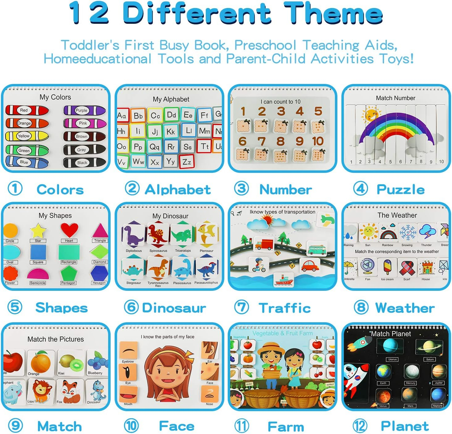 - KIDS FAVORITE DESIGN:We Designed 12 Themes for Toddler Learning Activities Ages 2-4, Including Colors, Letters, Numbers, Rainbow, Shapes, Dinosaur, Vehicle, Weather, Match The Pictures, Cognition of Facial, Vegetables, Fruits, and Planets Etc.