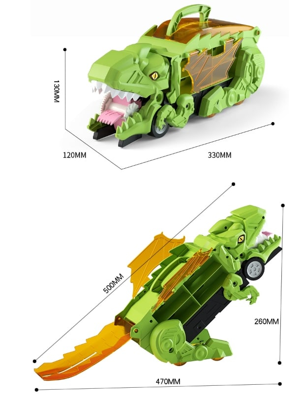 ćNovel Gaming ExperiencećRoll this dinosaur transport vehicle by hand, it can devour alloy vehicles, which is very interesting and can bring a novel gaming experience to children! Put down the back of the car and rotate the four feet. Standing up, this large transport vehicle will become a standing Tyrannosaurus Rex!